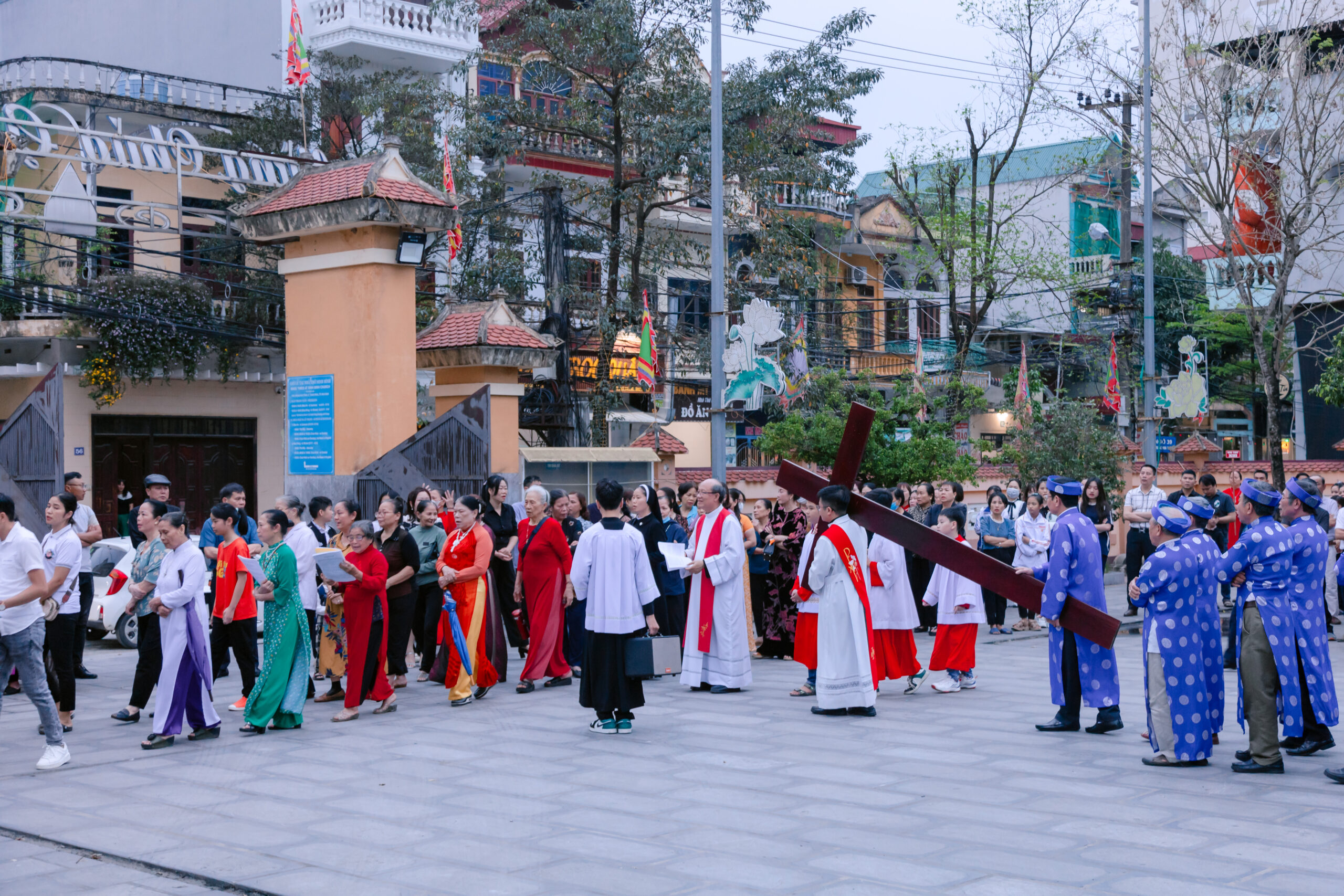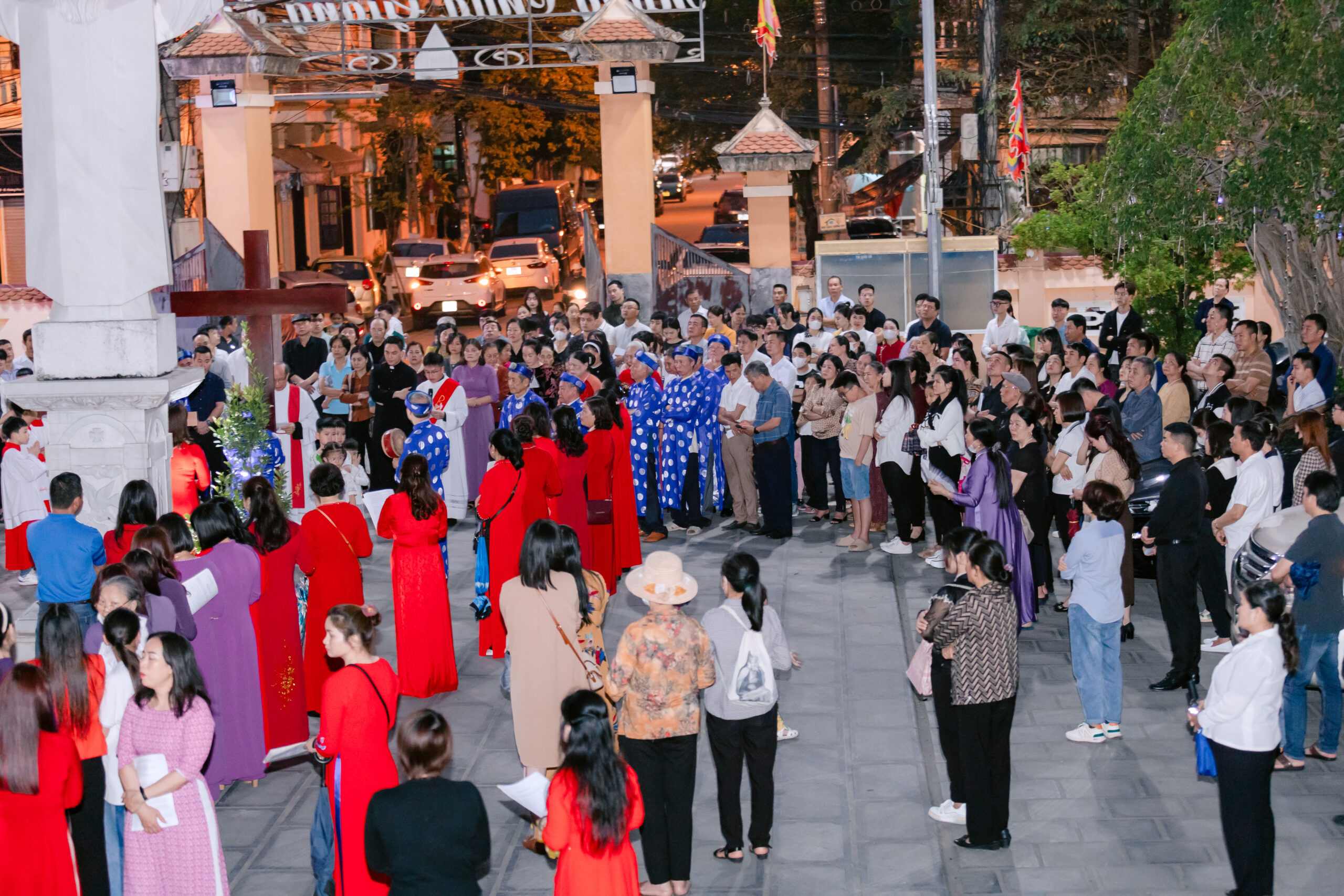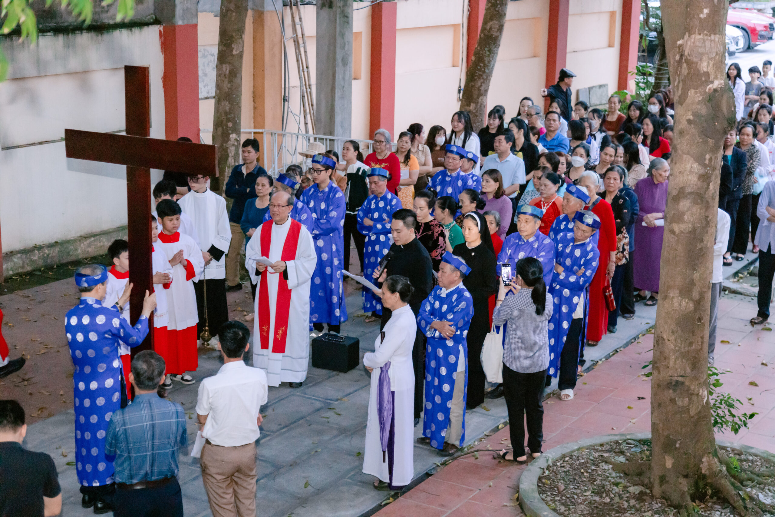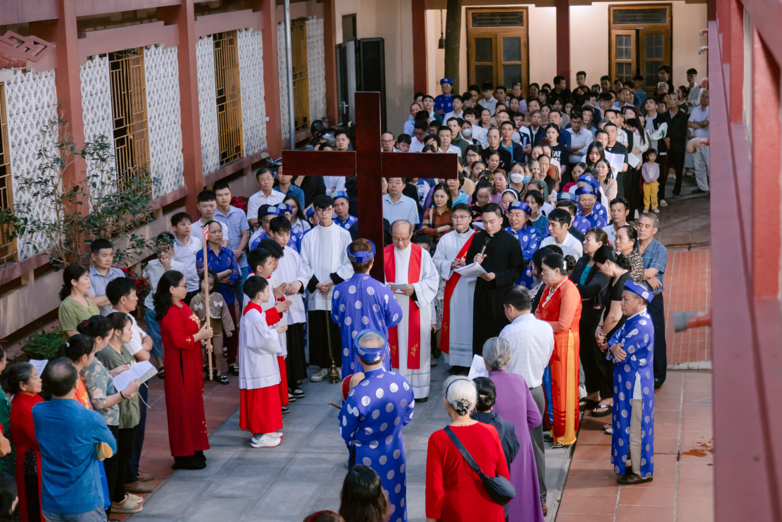 Trước khi bước vào nghi thức tưởng niệm cuộc Thương Khó, cộng đoàn sốt sắng đi Đàng Thánh Giá trọng thể được cử hành xung quanh khuôn viên nhà thờ. Các bài suy niệm chặng Đàng Thánh Giá dựa theo chủ đề mục vụ năm nay của Giáo Hội Việt Nam, mời gọi các tín hữu tham gia vào đời sống của Hội Thánh, ngang qua những con người ‘tham gia’ với Chúa trên đường Thương Khó lên đồi Canvê xưa.